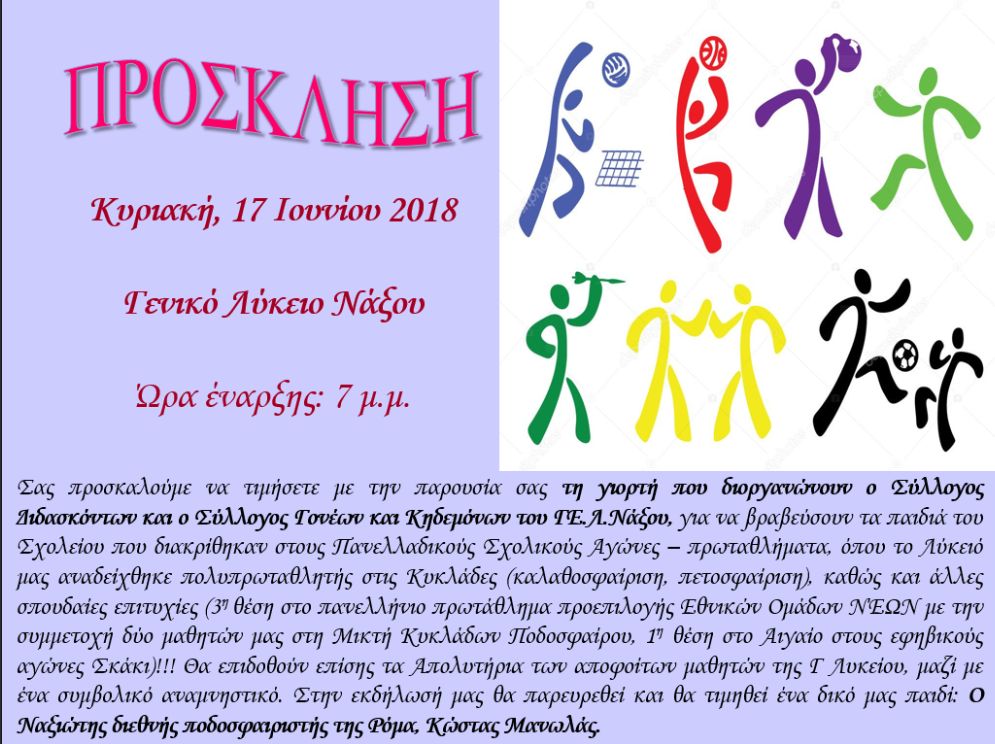 «Ο Σύλλογος Διδασκόντων και ο Σύλλογος Γονέων και Κηδεμόνων του Γενικού Λυκείου Νάξου, σας προσκαλούν στη γιορτή που διοργανώνουν την Κυριακή 17 Ιουνίου στις 7 μ.μ. στο χώρο του σχολείου για να βραβεύσουν τους μαθητές που διακρίθηκαν στους Πανελλαδικούς Σχολικούς Αγώνες - πρωταθλήματα...